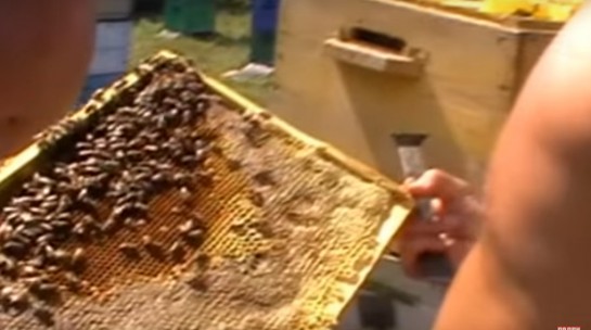 Это рамка с пчёлами и запечатанным мёдом (после заполнения сот, пчёлки сами запечатывают соты воском). Этот мёд мы откачиваем в специальных устройствах (медогонках). Как видите пчёлки очень маленькие, чтобы наносить много мёда им необходимо очень сильно потрудиться. И заметьте, хотя они и маленькие, но не безобидные. Свои запасы они оберегают. У пчёл есть жало. Они жалом, как острой иголкой, прокалывают тело и впрыскивают яд. Для человека несколько укусов (уколов) не смертельны, но очень болезненные. Хотя пасечники и не реагируют на эти укусы (они к укусам пчёл уже привычные).